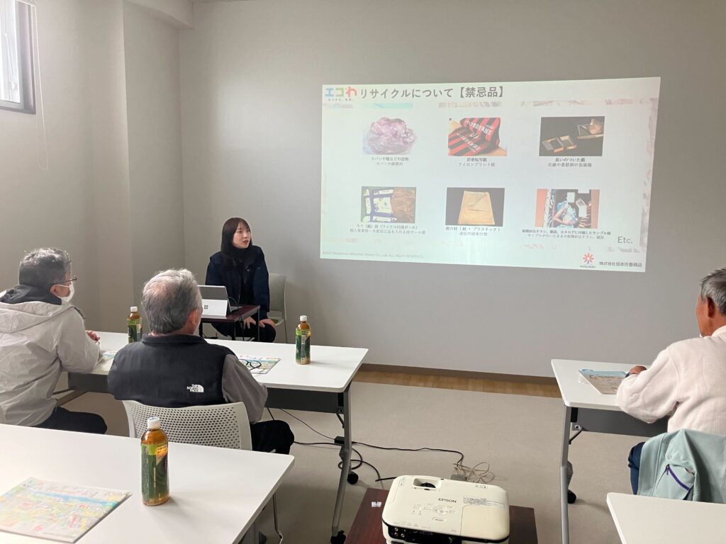 その後のエコ講座では、リサイクルの仕組みや禁忌品(リサイクルできないもの)について説明し、正しい分別やリサイクルへの理解を深めていただきました。次に、リサイクルレザーを使用したワークショップを実施しました。参加者の皆さまは、刻印を入れる作業を楽しみながら取り組まれていました。