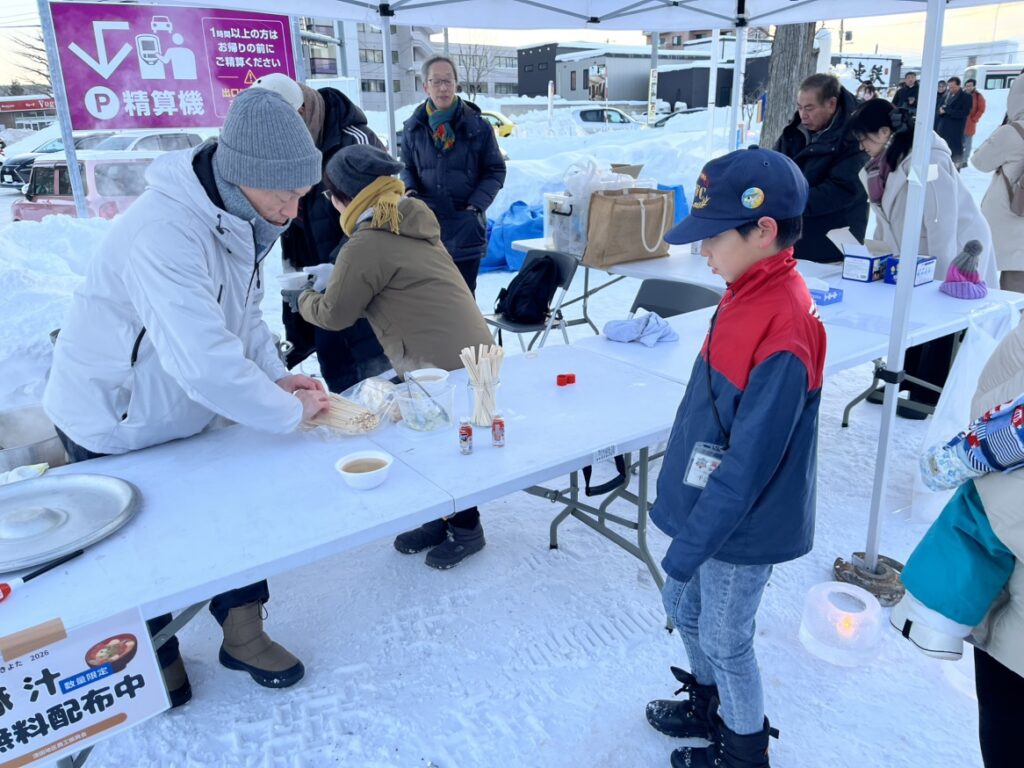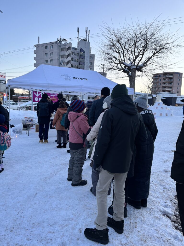 その日は札幌市内で今シーズン初の最低気温マイナス12度という極寒の中での開催となりました。16時からの点灯式にむけて準備した、300個のアイスキャンドルを会場内に並べたり来場された皆さまに無料でお配りする豚汁200杯の仕込み等、朝から寒さも忘れて会場の設営を進めました。